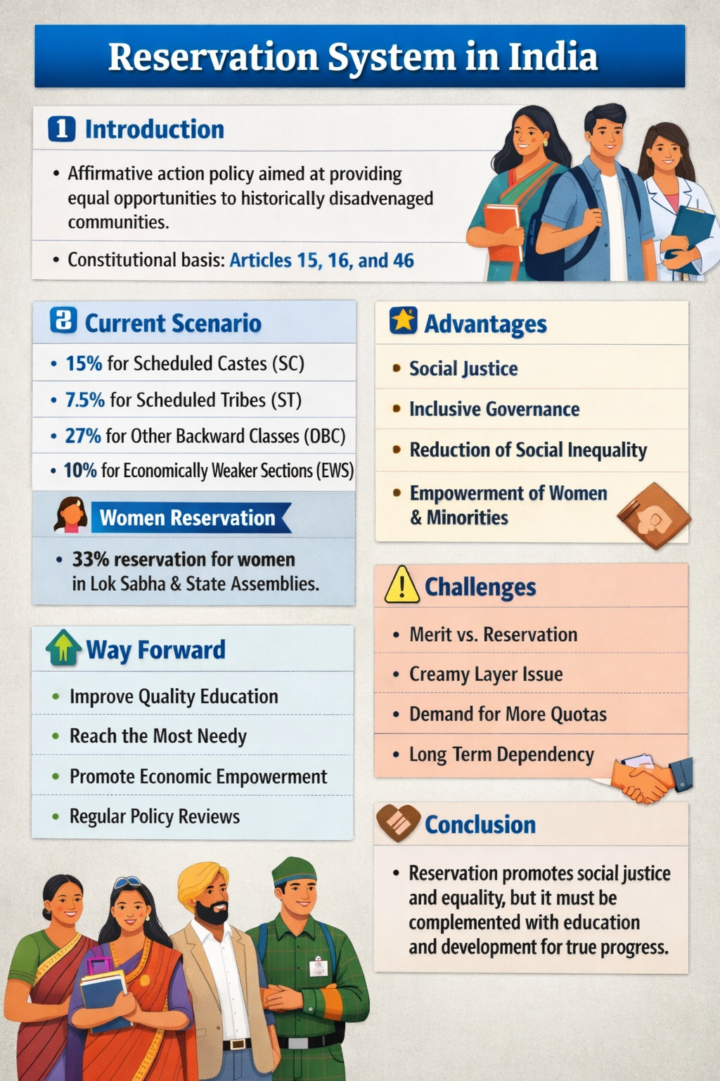 1️⃣ Introduction The reservation system in India is a policy of affirmative action designed to provide equal opportunities to historically disadvantaged communities. It aims to …