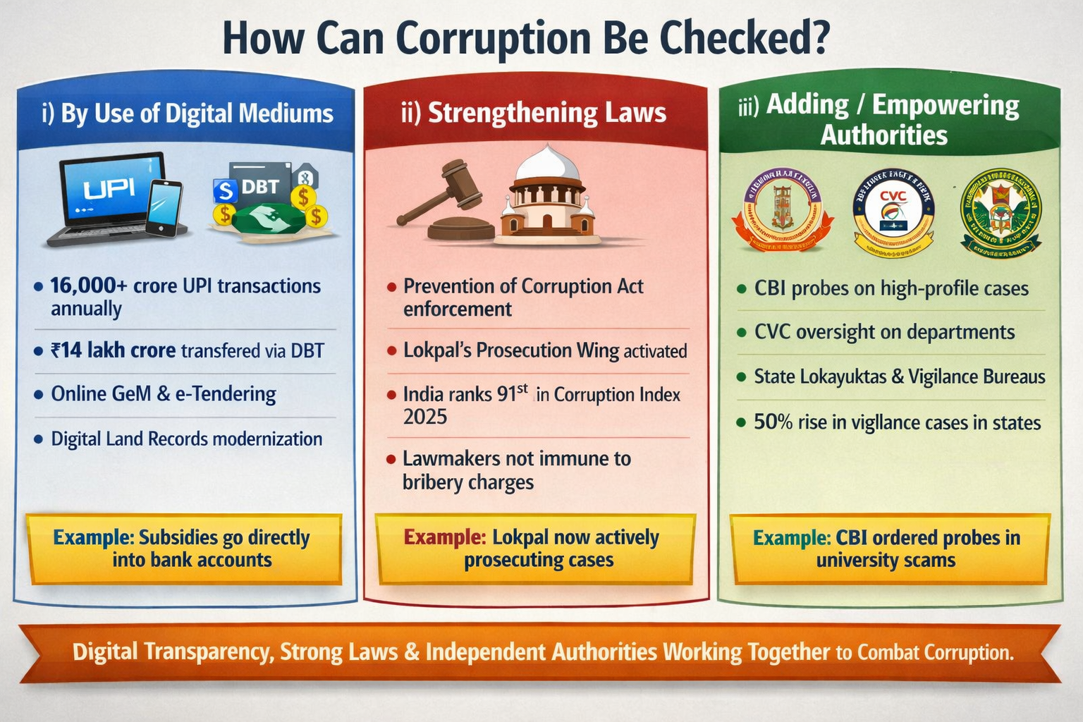 How can corruption be checked? –: i) by use of digital mediums ii) strengthen laws iii) adding more authorities Corruption weakens democracy, …